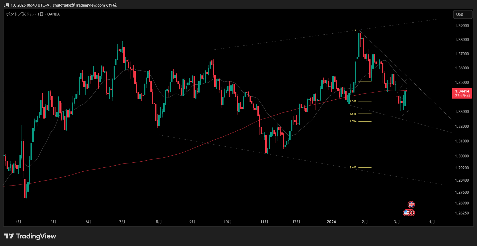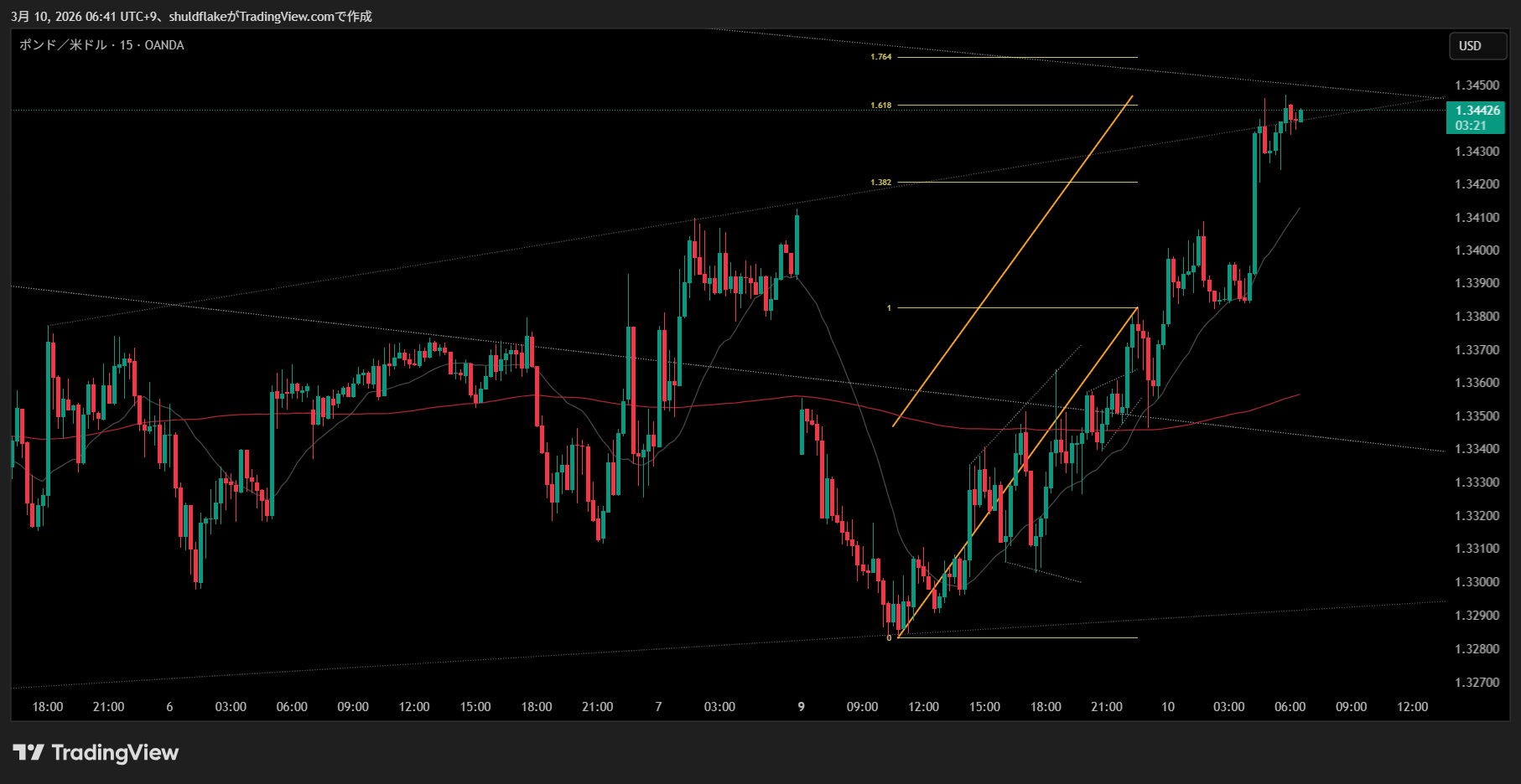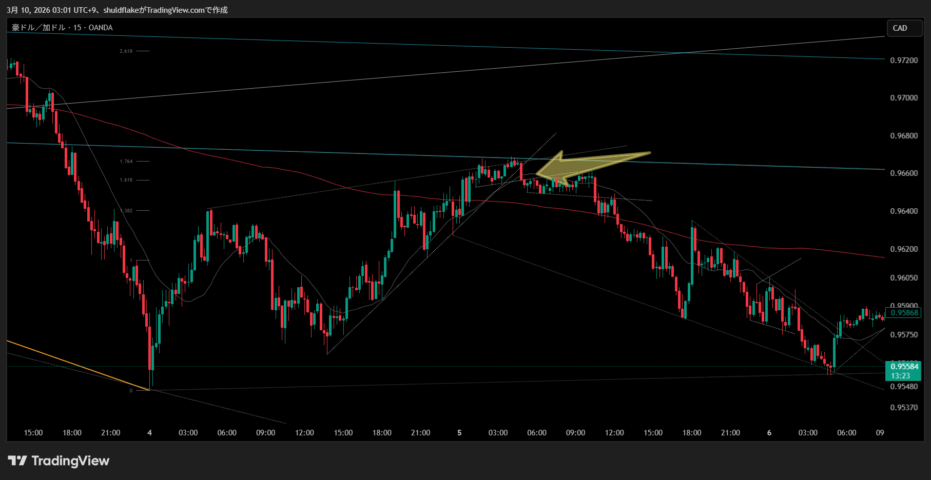 裏のフィボの1.764付近でチャネルの外側に当たる部分になる