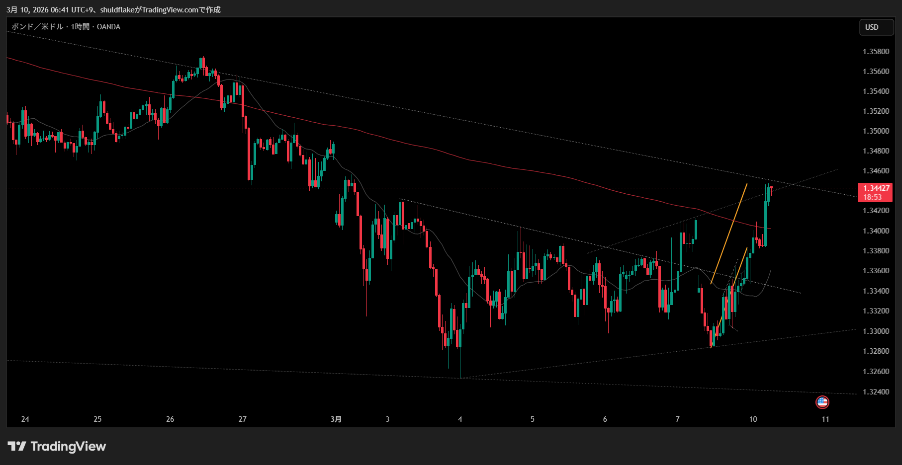 4時間足で引けるトレンドラインを綺麗に割ってきた