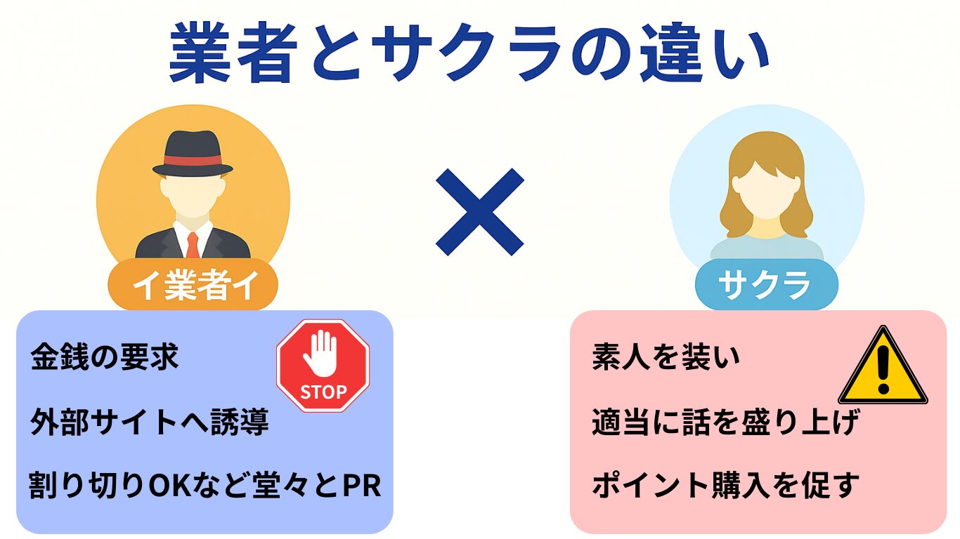 PCMAXにサクラはいませんが、業者は確実に存在しています。まずは、この両者の違いを正確に理解することから始めましょう。